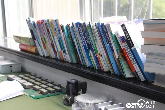 在廠里,有一間以周勇命名的“周勇技能大師工作室”,工作室的窗臺上摞的滿滿的專業書籍,供操作練習的工作臺、寫著密密麻麻專業術語的黑板,和擠滿房間、各種自己研制的“物件”,讓人仿佛走進一間科學家的奇幻小屋。
