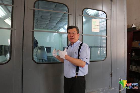 陶巍在汽車修理車間為記者介紹著汽車修理的新技術(shù)。中國青年網(wǎng)記者 劉尚君攝