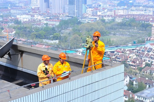 王斌在樓頂進(jìn)行測(cè)量工作。來(lái)源:上海建工機(jī)施集團(tuán)供圖。