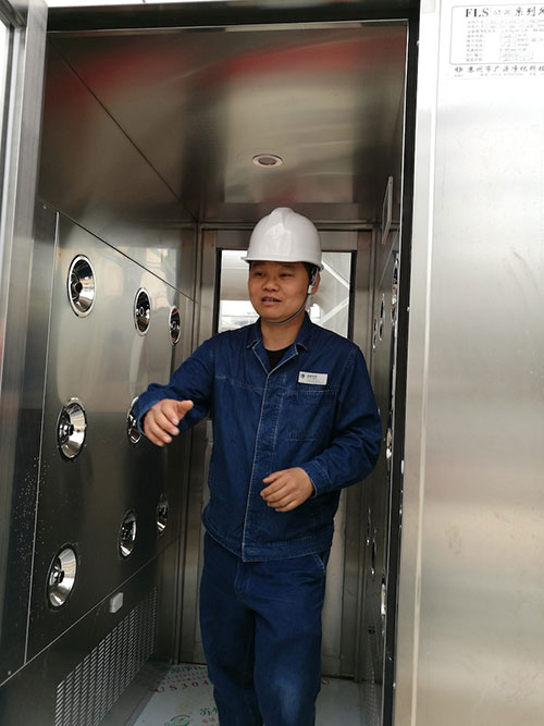 人在進入無塵安裝工廠時,需要經過無塵處理,如同進入無塵車間一般。(人民網記者章斐然 攝)