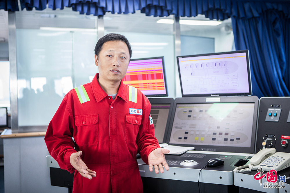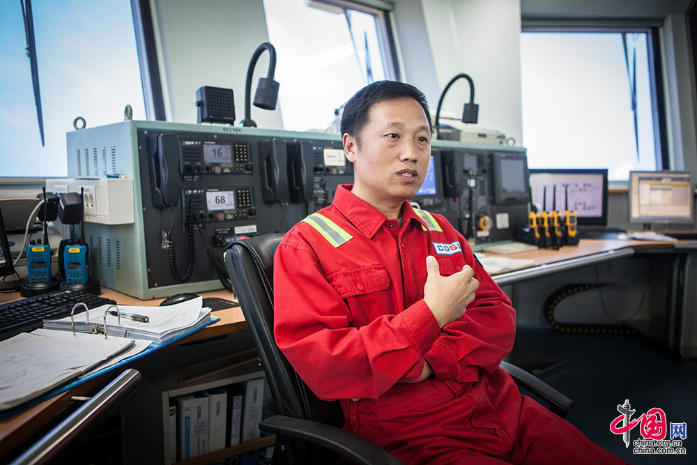 在我國自行設計建造并擁有自主知識產權的首座深水半潛式鉆井平臺建成后,蓋鳳喜放棄國外平臺薪酬優越的工作,毅然選擇加入國內首座深水動力定位平臺的作業團隊,參與運營前調試,海試等,以及最后在海上的實際運營。他帶領團隊完成動力定位作業所必須的操作手冊及程序,為安全作業提供保障。到目前為止該平臺保持良好的定位安全記錄,優于國外同類型定位系統的平臺在該區域的作業水平。中國網記者 倫曉璇 攝
