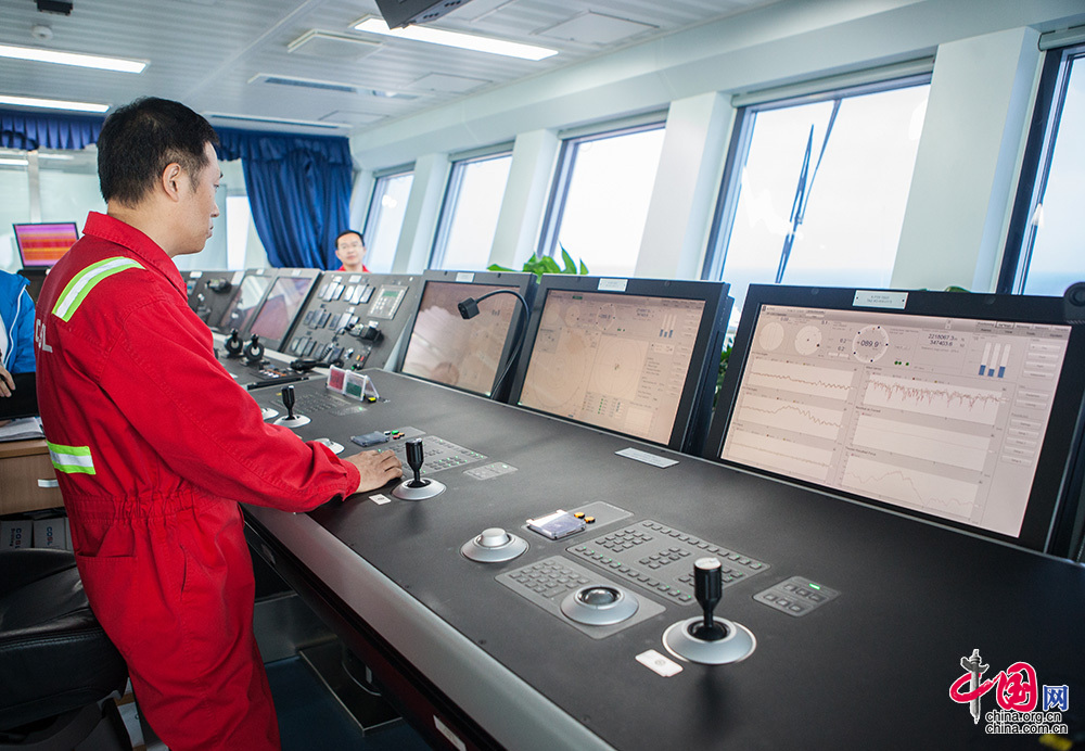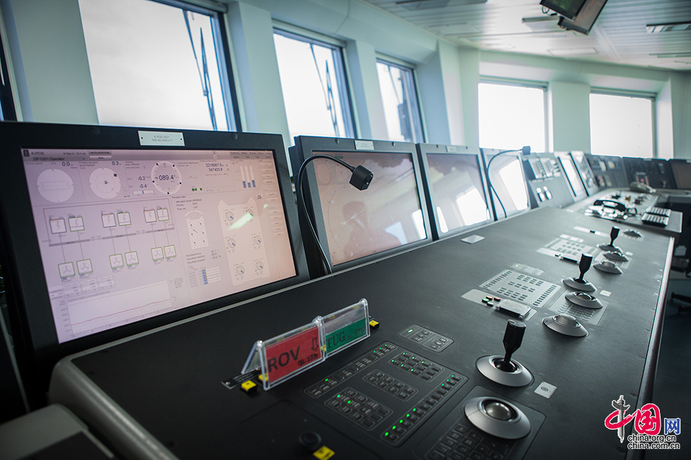 “興旺號”有很多精準的傳感器,能實時感知水流、風速、風向、平臺縱搖橫搖上下升沉的變化,它還擁有精確的衛星及聲納位置參考系統動力定位系統,通過分析傳感器及系統提供的數據對推進器的推力和方向進行調整,確保平臺定位在指定位置。中國網記者 倫曉璇 攝
