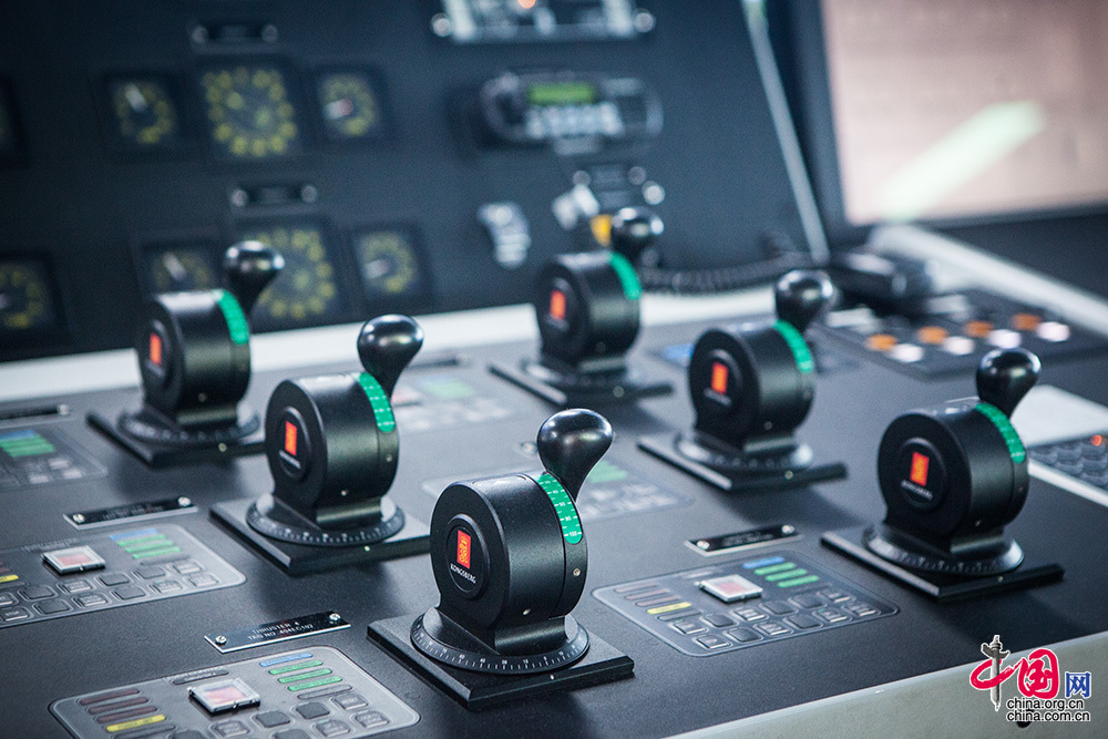 六個推進器操作手柄,可以遠程控制六個螺旋槳,動力定位系統會調整推進器的推力和方向,保障平臺定位在指定位置。中國網記者 倫曉璇 攝