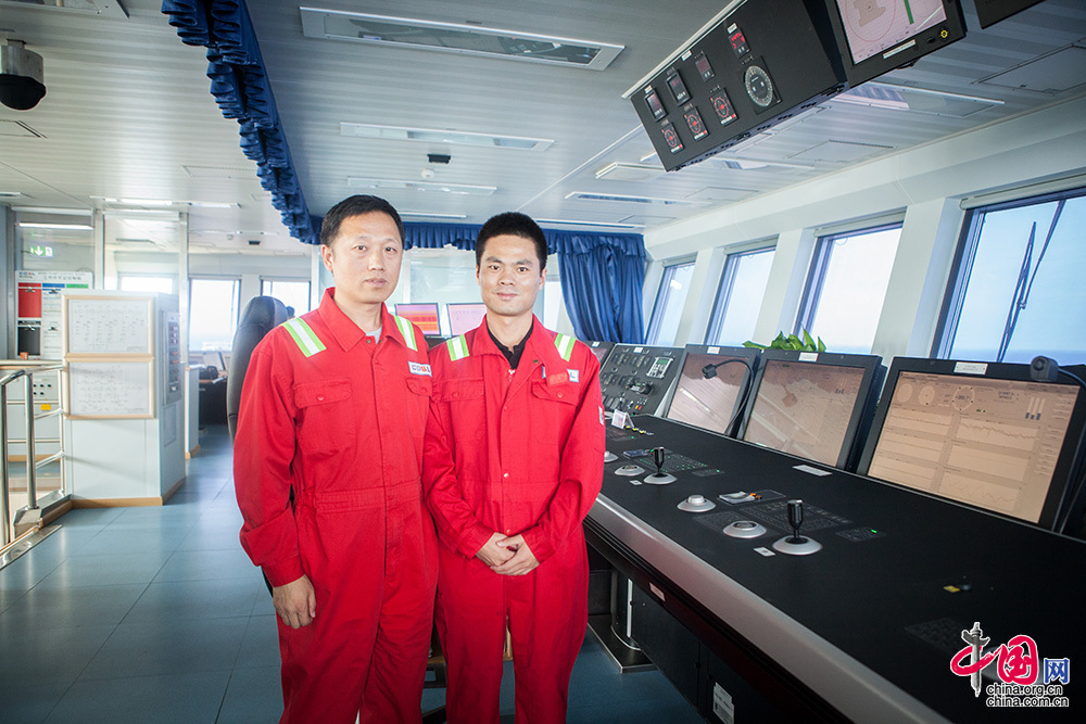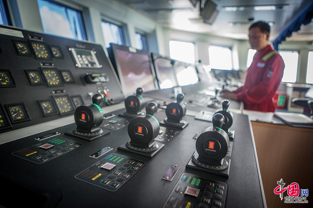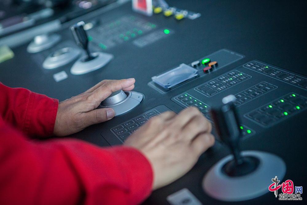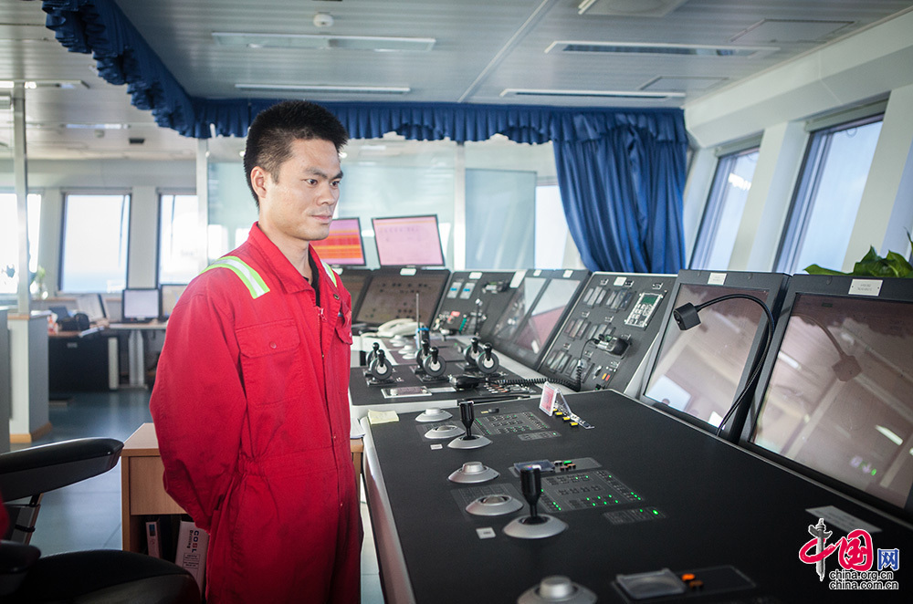 越是高精尖的設備對操作者的技術要求就越高。作為高級定位師,他們負責掌控動力定位系統,確保船舶“紋絲不動”。此外,在平臺航行、移位過程中,定位師還負責制定具體航線。他們不僅需要密切關注設備的運行,還需注意氣象和海況的變化,其中臺風就是作業的最大風險之一,因為平臺移動速度慢,有時還懸掛隔水管,不可能駛離太遠,定位師的操作直接關系到整個平臺船體結構的安全及人員安全。中國網記者 倫曉璇 攝