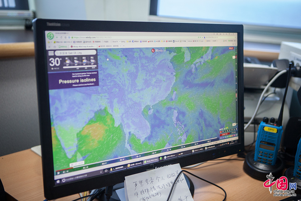 就在不久之前,臺風“泰利”逼近我國東南、華南沿海,接著熱帶氣旋“杜蘇芮”緊跟而來。通過對公司提供的臺風路徑預報及各種氣象信息分析匯總,結合現場的作業情況,平臺制定了相應的避臺方案及應急預案,并在執行中隨臺風路徑變化而調整,臺風過后,“興旺號”及時恢復了生產。憑借近20年在南海區域的避臺及海事經驗,蓋鳳喜實時提供有價值的參考信息,科學避臺,節約了作業成本。中國網記者 倫曉璇 攝
