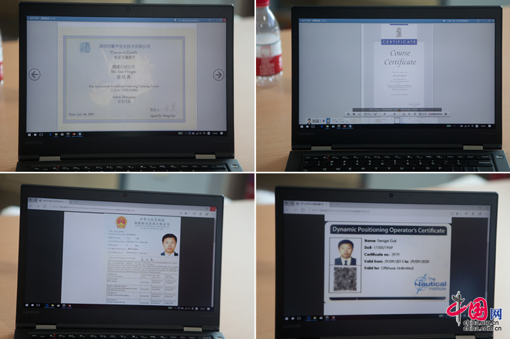 蓋鳳喜是國內較早持有并從事動力定位作業人員之一。在此之前,國內海工領域的所需的動力定位人員只能高價從國外聘請。1993年,蓋鳳喜從大連海事大學畢業,實現了自己的航海夢,隨遠洋油輪,穿梭于世界各大洋中。上世紀末,擁有動力定位技術的海洋裝備在世界各地開始出現。對于航海科技有著強烈好奇心的蓋鳳喜,抓住機會通過外籍船東的面試,投入到這一領域,在國外完成動力定位及相關培訓課程,并取得英國航海家協會頒發的動力定位證書,開始了連續10年的動力定位船舶和鉆井平臺的技術積累。中國網記者 倫曉璇 攝