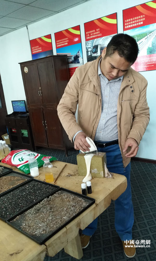 杜天剛在演示防滲堵漏模型。(中國臺灣網 王文英 攝)