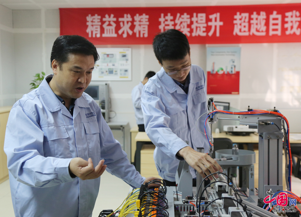 為了降低成本,工作室的教學設備均為自制。在不斷的教學摸索中,工作室 獨創了“2+1”培訓課程,主要含義為:在工作室脫產培訓2個月,其中理論學習與實際操作各一個月然后回到車間1個月的時間來學以致用,三個月為一期。培訓主要針對的是電子,機械,機電,自動化等設備相關人員。培養方式采用雙導師制,培訓期間由劉源等大師親自指導,回到車間由機電設備工程師進行工作實踐指導,實現脫產培訓與工作實踐的完美結合,通過一至兩年的學習從而實現一年達到同等高工水平,兩年達到同等技師水平的理想目標。(中國網 楊楠 攝影報道)