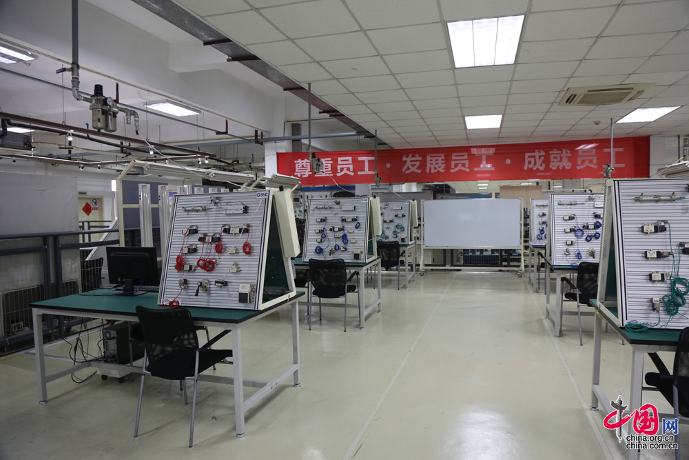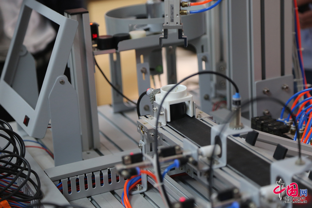 學員用來練習的光機電一體化實驗裝置,這是一個模擬機械手臂編程自動識別分揀系統,如果一個學員可以獨立完成模擬機械手臂的編程,基本就達到了技師水平。(中國網 楊楠 攝影報道)