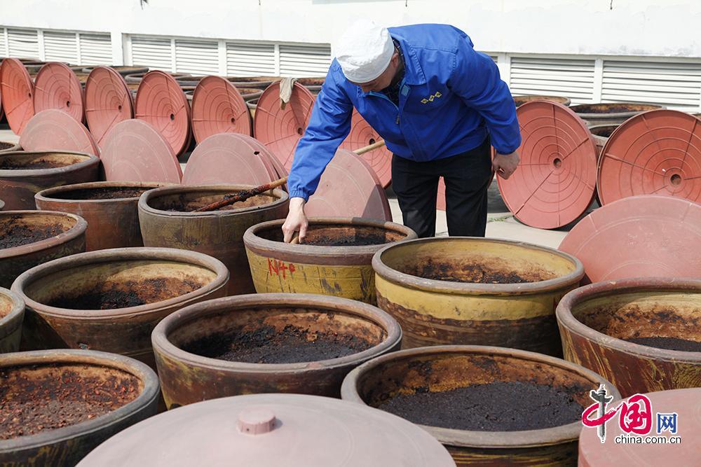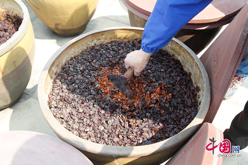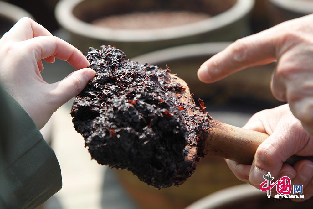 據了解,一缸郫縣豆瓣每天翻曬12次,三年特級郫縣豆瓣至少經歷翻曬13140下,五年特級郫縣豆瓣至少經歷翻曬21900下。中國網 李佳攝影