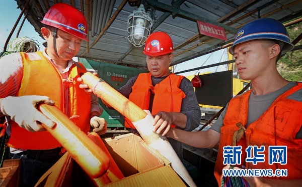 李紅勇(左一)在施工現場檢查裝炸藥(資料照片)。 新華社發