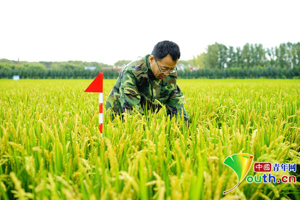 金立軍在試驗(yàn)田里查水稻情況。中國(guó)青年網(wǎng)見習(xí)記者 劉逸鵬 攝