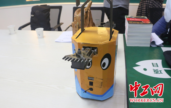 周紅亮和團(tuán)隊(duì)研制的小黃人“線路除障精靈”。中工網(wǎng)記者 朱晶晶 攝