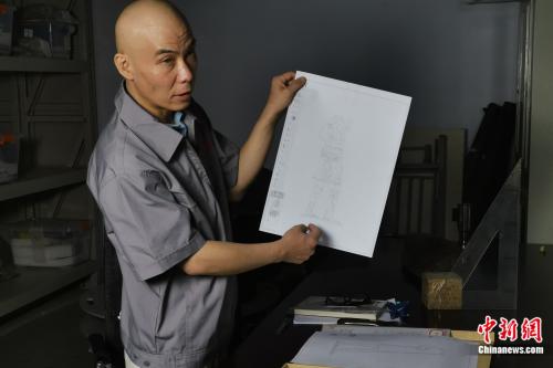 馬宇展示保存的文物修復手繪圖。張旭 攝