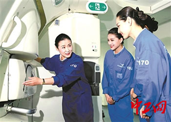 朱文霞(左一)為“小白鷺”進行客艙服務訓練。