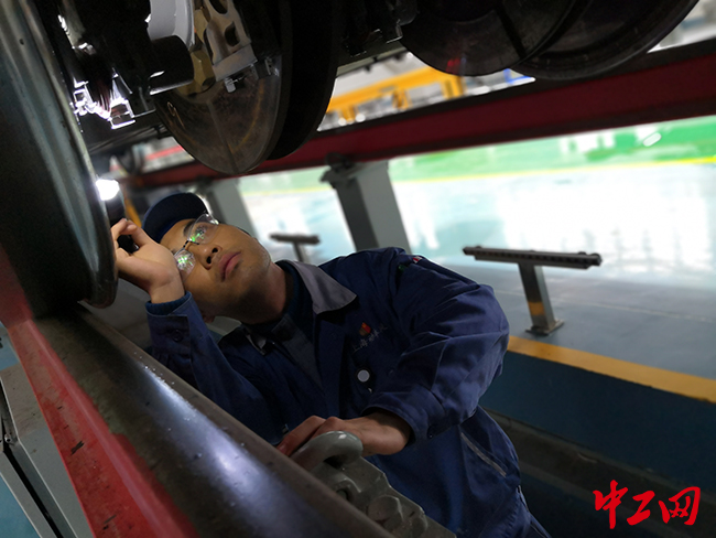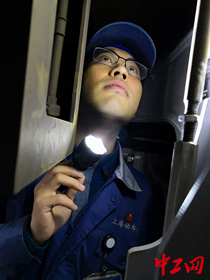 在現(xiàn)場,陳駿亞練就了“千里眼”和“順風耳”的絕活。在600米長的檢修庫內(nèi),他腰挎黑色帆布包,打著手電筒走一圈就能發(fā)現(xiàn)車輪和鐵軌的接觸面上超過0.5mm的擦傷,同一處車架上四個車輪直徑差大于1mm的安全隱患。同時聽六臺風機的聲音就能判斷出有問題的風機可能存在的安全風險。有時,旅客會有意強行將可樂瓶蓋塞進機箱死角,陳駿亞就要對車上55萬個零部件一一拆卸檢查復位,并以最短的檢修時間保證動車組以全新面貌零故障上線運行。
