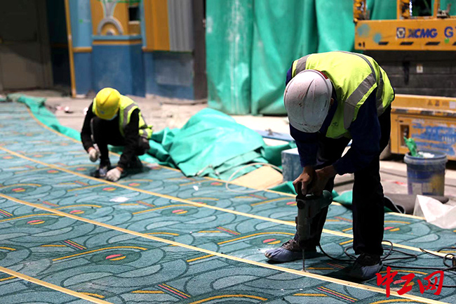 工人正在對(duì)園區(qū)內(nèi)的劇院安裝