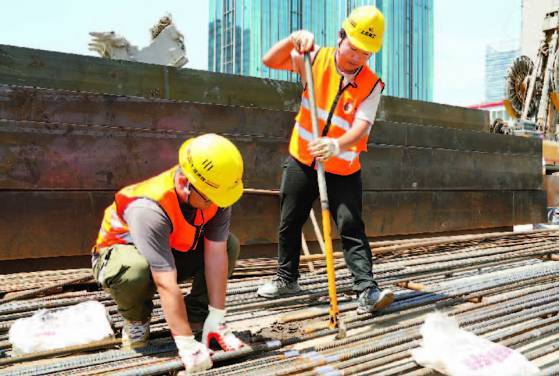 隨著上海氣溫不斷攀升,項目工地也啟動了“兩頭班”模式,實行早開工、早收工,避開太陽最火辣的時間段。可即便避開了高溫時間段,露天環境下,需要作業的鋼筋被烤得滾燙。在現場可以看到張洪滔熟練地操作著工具鉗,精準旋緊鋼筋連接套筒,熱汗從他臉頰上淌下,隔著橡膠手套的雙手被燙得通紅。