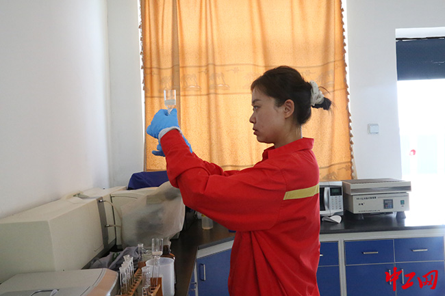 她們是生產監控的“眼睛”、是通往水質達標的“風向標”,也是化驗室里的“鏗鏘玫瑰”。每天她們都要從2萬方生化站取8個出口的水樣,再從采出水氣浮出口、終沉、二沉、外排、生化沉降池各節點常規取樣, 再趕緊回到實驗室里檢測水含油,水中化學需氧量,測懸浮物,一天下來,她們至少要做100個實驗。各項檢驗分析忙忙碌碌、緊緊張張,姑娘們總是會累的汗流滿面,腿酸手軟,渾身油污。
