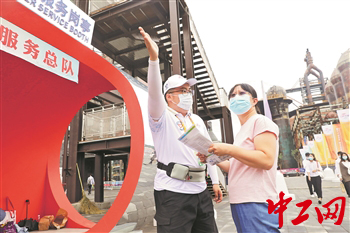 9月5日,北京首鋼園內(nèi),張孟巖(圖左)正在為觀眾做引導(dǎo)。1998年出生的張孟巖是首鋼京唐公司的一名磨輥工。今年8月份,有過志愿服務(wù)經(jīng)驗的他被抽調(diào)至北京首鋼園成為了一名服貿(mào)會志愿者。對于他來說,這次在首鋼園做志愿者感覺像回家,在這兒經(jīng)常能碰到首鋼的老職工向他詢問服貿(mào)會的相關(guān)情況以及新廠區(qū)的發(fā)展?fàn)顩r。張孟巖說:“作為首鋼職工能在首鋼園做志愿者,內(nèi)心有一種驕傲和自豪感。”工人日報-中工網(wǎng)記者 王偉偉 攝