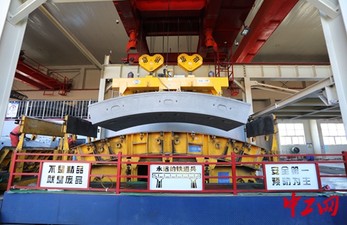 真空吸盤從模具中吊起管片運送至翻轉機上大約需要3分鐘,為確保萬無一失,他們在通道下方設置了一層鋼模隔板,為安全生產上了“雙保險”。