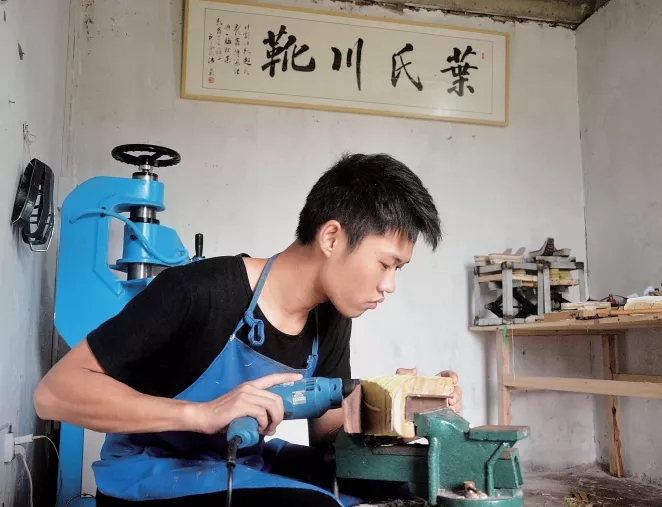 趙浩鑫在制作川劇靴子