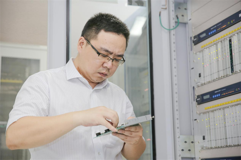 張霽明與同事一起在電源機(jī)房檢測電源。新華網(wǎng)發(fā) 鄭之超 攝