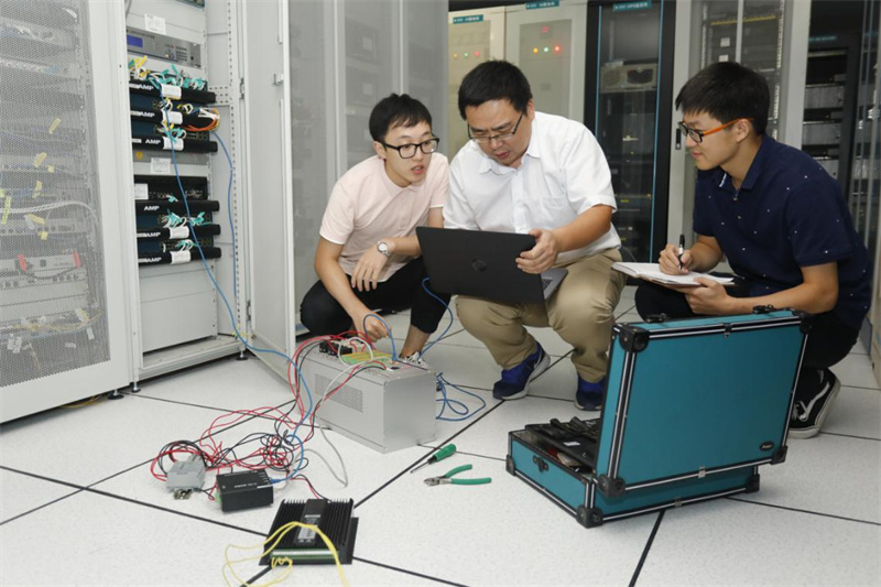張霽明與團(tuán)隊(duì)一起測試5G智能檢修機(jī)器人“哪吒”。新華網(wǎng)發(fā) 鄭之超 攝