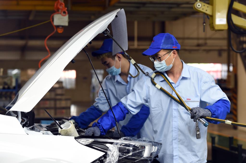 2020年5月20日,在位于安徽省蕪湖市的奇瑞汽車股份有限公司,工人在總裝三車間忙碌。新華社發(周牧攝)