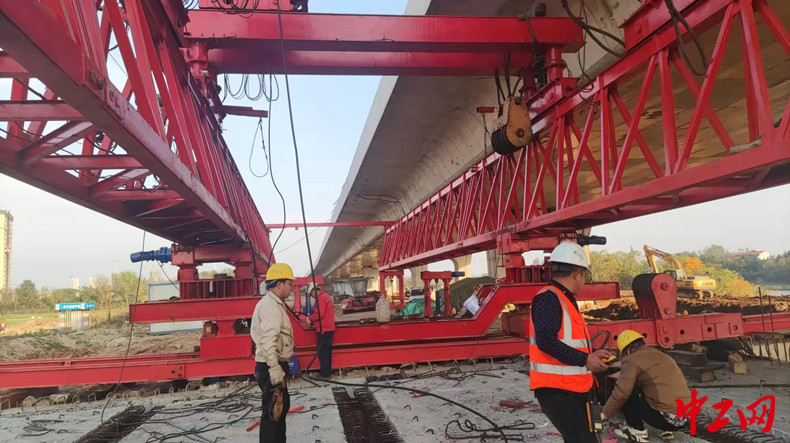 中建二局土木工程集團(tuán)有限公司武漢黃陂項目部通過改變卷揚機(jī)和吊梁扁擔(dān)的整體連接方式,把卷揚機(jī)固定在起吊天車最外側(cè),通過4根承重60T的鋼絲繩把吊梁扁擔(dān)與起吊天車連接在一起。在不改變架橋機(jī)受力方式的前提下,實現(xiàn)梁片橫向自由移動,極大提高了預(yù)制箱梁架設(shè)速度,把原本112天的工期縮短至32天。(中建二局土木工程集團(tuán)有限公司 黃燦)