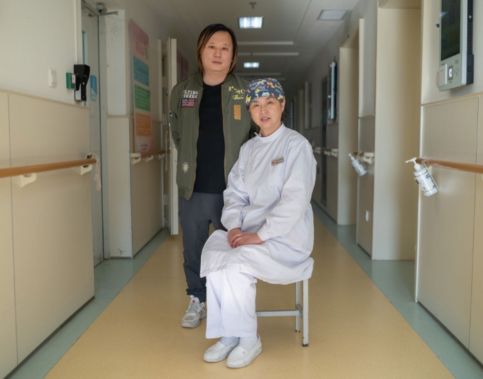 ↑張淑萍與1984年她剛上班時候接生的“寶寶”柳應泉合影留念。柳應泉長大后來到醫院的后勤部門工作,他稱張淑萍為“媽媽”(5月9日攝)。