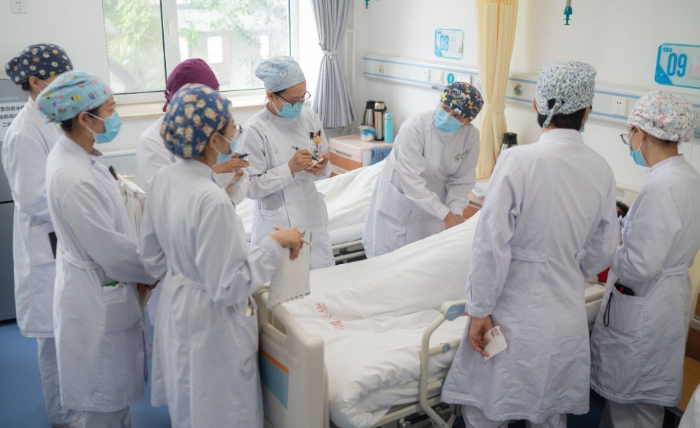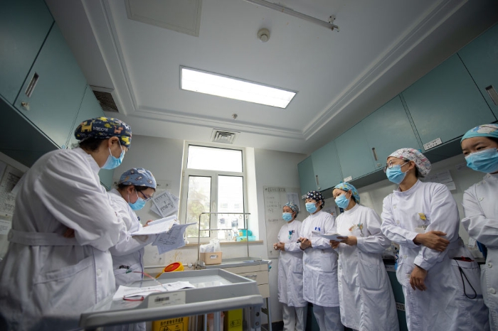 ↑清晨,張淑萍(左一)帶領白夜班護士交接班(5月10日攝)。