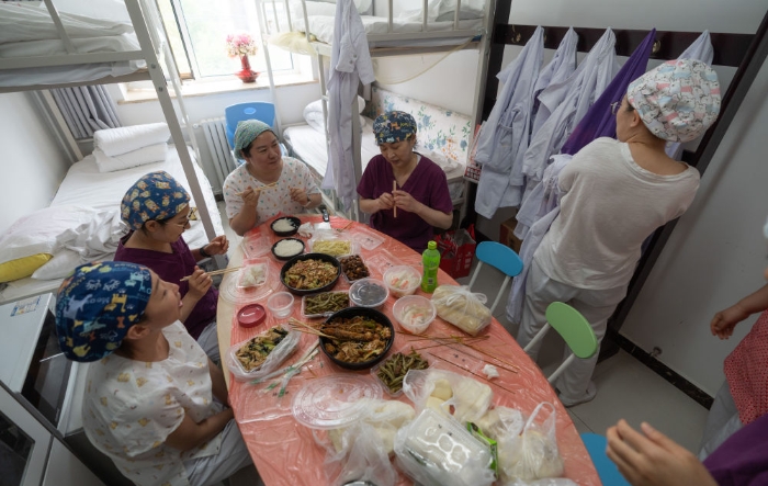 ↑張淑萍(右二)與同事一起吃午飯(5月9日攝)。