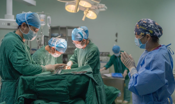 ↑張淑萍(右一)在手術室內準備迎接新生兒(5月9日攝)。