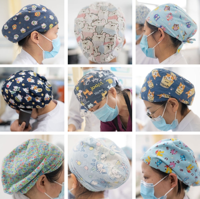 ↑這張拼版照片顯示的是張淑萍(中)與同事戴著各式卡通造型的帽子(5月9日攝)。這種帽子有助于緩解孕婦與患者在病房內的情緒。