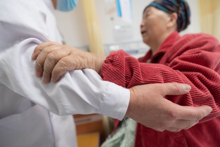 ↑張淑萍(左)攙扶一名老年患者(5月10日攝)。