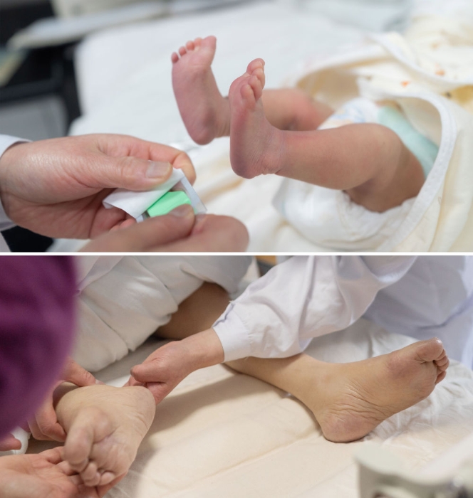 ↑這張拼版照片顯示的是:張淑萍為一名新生兒做足跟血篩查(上圖,5月10日攝);張淑萍檢查一名終末期重癥患者水腫的腳(下圖,5月10日攝)。