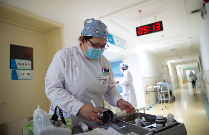 ↑凌晨,張淑萍的同事梁元整理給病人測量生命體征所需的設備(5月10日攝)。