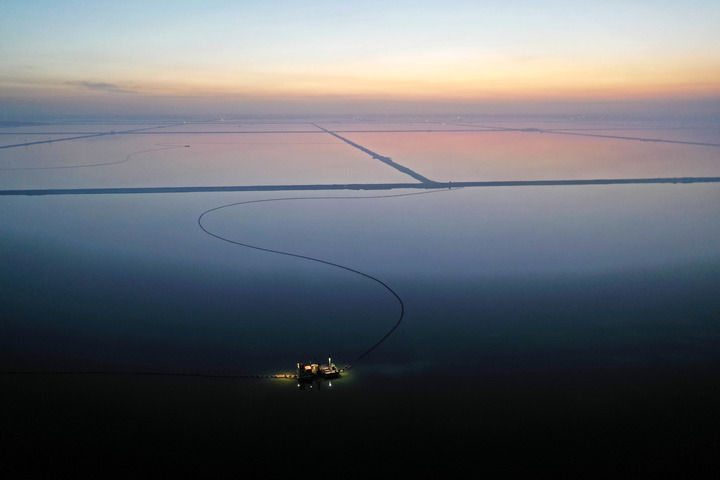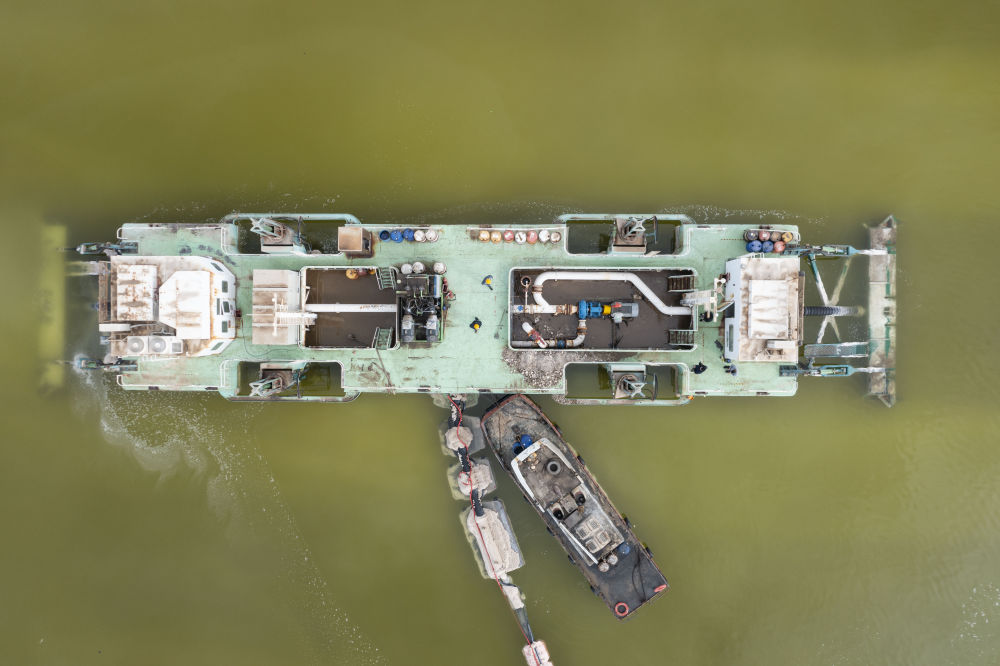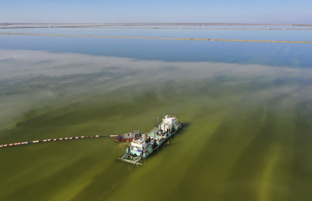 水采船在察爾汗鹽湖中作業(2月2日攝,無人機照片)。