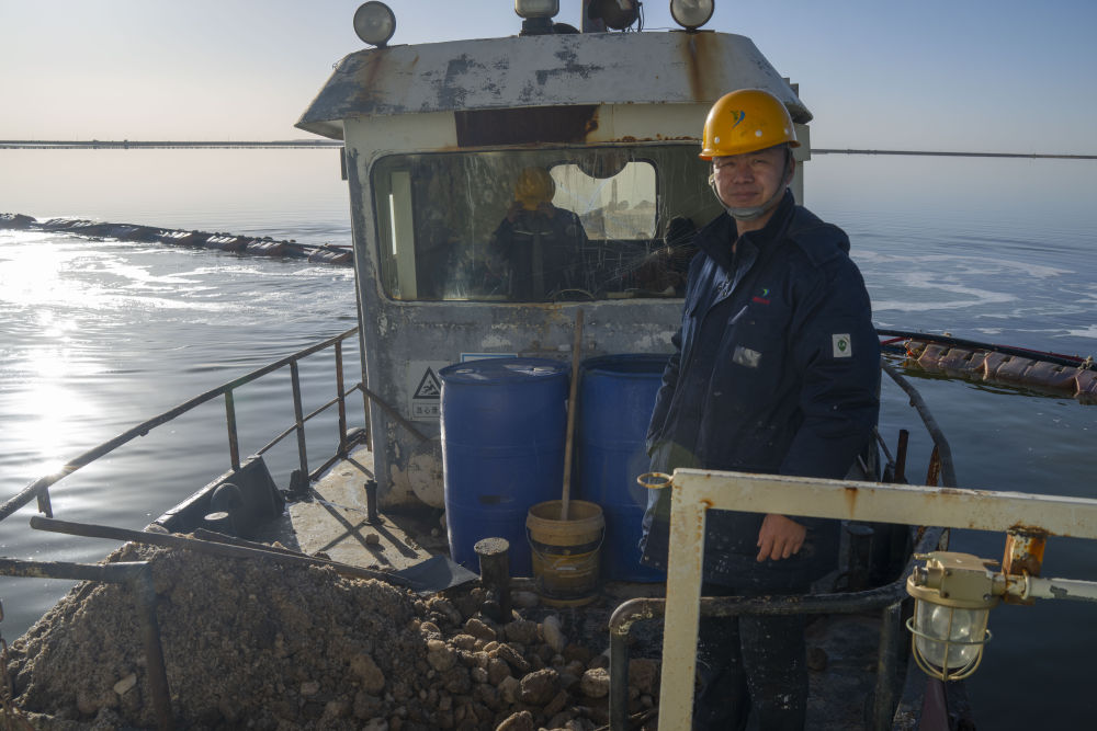 2月2日,賀連福乘坐工作船(下)到達水采船(上)。水采船在劇毒的鹵水鹽田中作業,工作人員每天上下水采船都要通過工作船接駁。