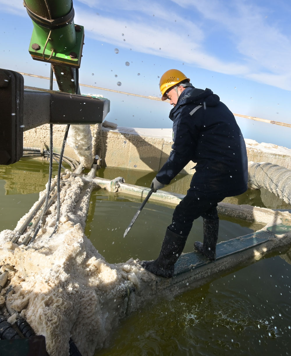 2月2日,賀連福(右)與同事駕駛工作船運輸鹵水結晶。