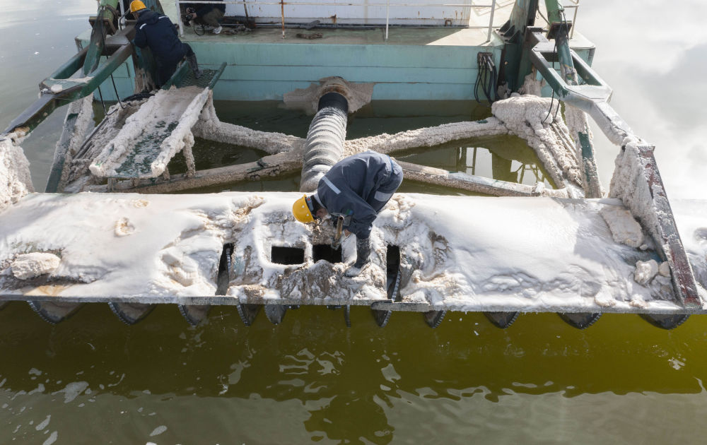 2月2日,賀連福(右)與同事將水采船上清理出的鹽塊轉移到工作船上清運走。