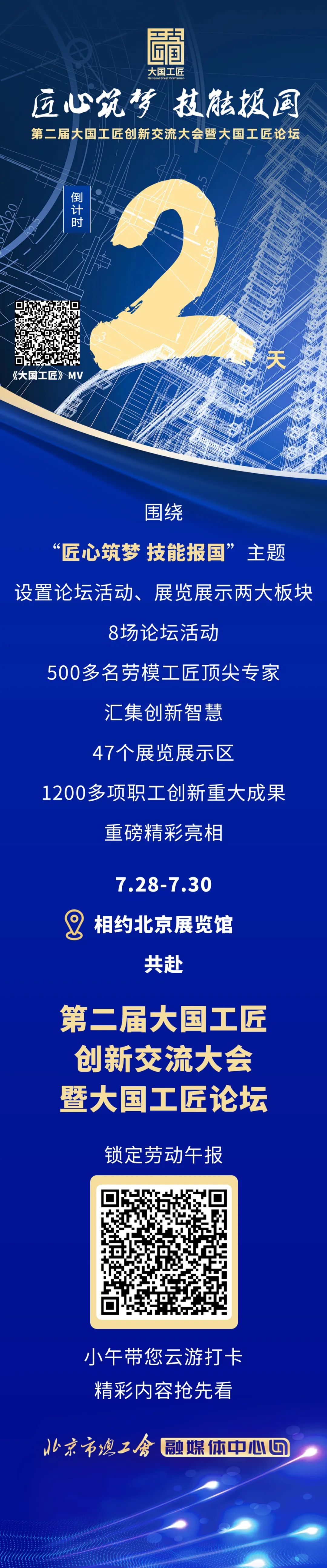 由中華全國總工會、中共北京市委、北京市人民政府共同主辦,中華全國總工會勞動和經濟工作部、北京市總工會具體承辦,以“匠心筑夢 技能報國”為主題的第二屆大國工匠創新交流大會暨大國工匠論壇將于7月28日至30日在北京舉辦。主題音樂《大國工匠》通過對各省市、各行業大國工匠勞動場景和個人風采的全景展示,生動展現了大國工匠在中國制造、中國創造中的卓越貢獻,在強國建設、民族復興中的重要作用。主題音樂《大國工匠》由著名詞作家、職工藝術家宋青松作詞,著名作曲家、職工藝術家修駿作曲,青年歌唱家柏文、湯非演唱,曾獲當代歌曲精品工程獎。