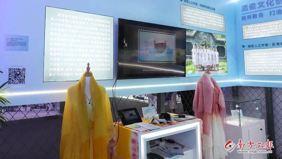 在展區左側,兩套色彩斑斕的中國風服飾讓人眼前一亮。“我帶領團隊研制出108種天然染色配方,制作出的植物染多巴胺系列服飾。”教育醫療創新工作室聯盟成員、廣東外語藝術職業學院教授尹春潔站在展位前介紹。