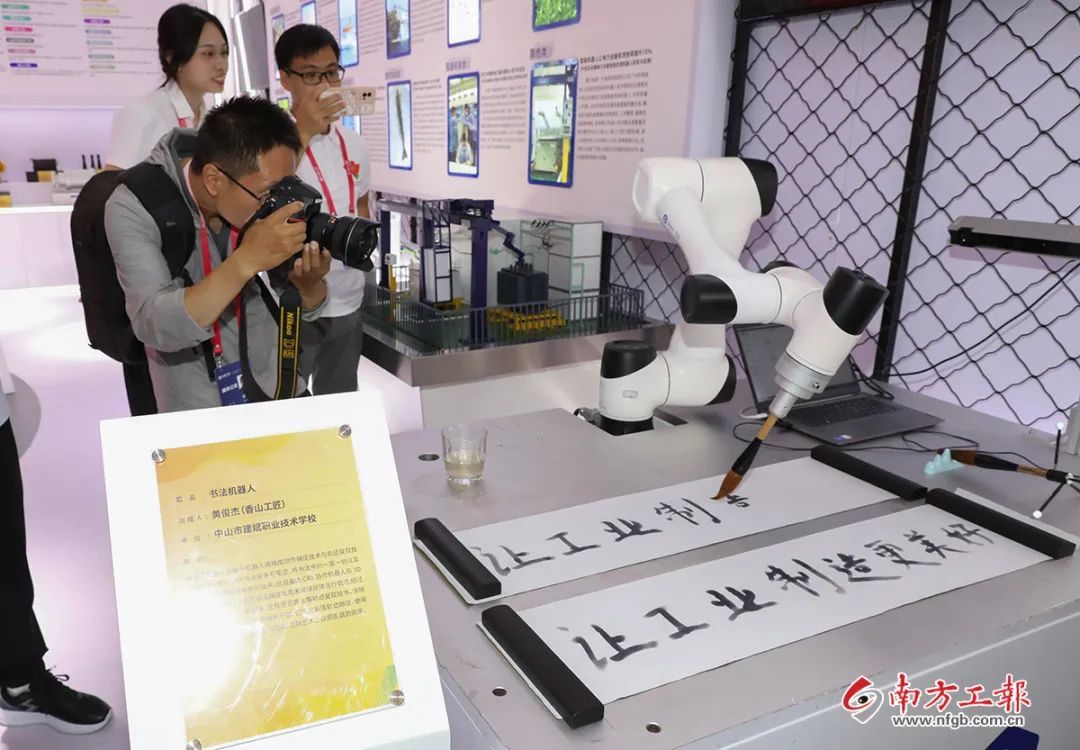 在饒寶蓮的旁邊,香山工匠、中山市建斌職業技術學校教師黃俊杰正在介紹自己帶來的兩款互動機器人。其中書法大師工業機器人設備基于機器人高精度動作捕捉技術與軌跡復現技術,可以模仿書法家手寫筆跡,將書法中的一筆一劃以及濃厚的個人風格完美復刻出來;高速分揀搬運工業機器人則配合彩色視覺系統,可以有效分揀外觀接近但顏色不同的小零件,適用于自動化工廠的小零件分揀、整列、裝盒,能夠有效提高分揀效率和穩定性,大大降低工人的勞動強度。