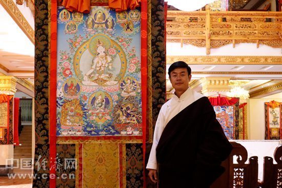 完德尖措和他獨(dú)立完成的唐卡作品《白度母》。中國(guó)經(jīng)濟(jì)網(wǎng)記者 李凡攝。