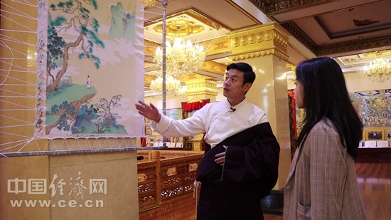 完德尖措講述唐卡與傳統(tǒng)工筆畫的結(jié)合創(chuàng)新作品。中國(guó)經(jīng)濟(jì)網(wǎng)記者 李凡攝。