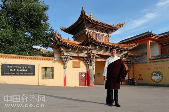 完德尖措站在熱貢龍樹畫苑前。中國(guó)經(jīng)濟(jì)網(wǎng)記者 李凡攝。