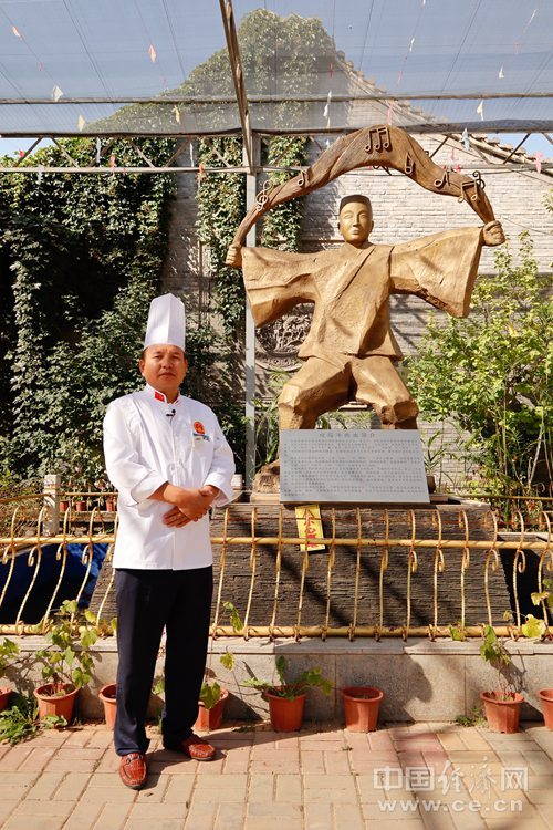 韓玉龍與化隆牛肉面雕像。中國經濟網記者 李凡攝