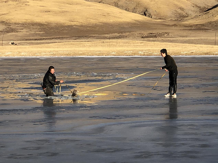 2019年11月,加羊多杰在和2名同事一起巡護時,遠遠看見結了冰的湖面上有一抹黑影。因為冰面斷裂,一匹狼被困在了湖中心。回憶起這段經歷,加羊多杰仍然很緊張,“當時的氣溫是零下十幾度,我們可用的工具只有繩子,如果不能在天黑前完成救援,狼就會被凍死。”